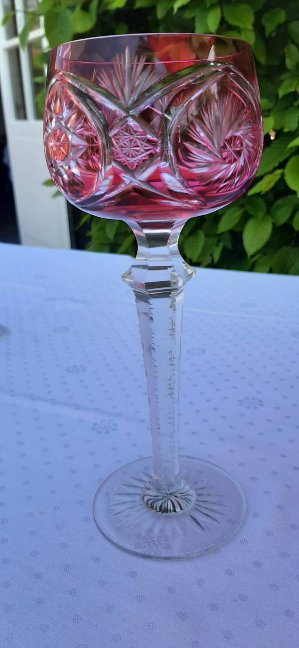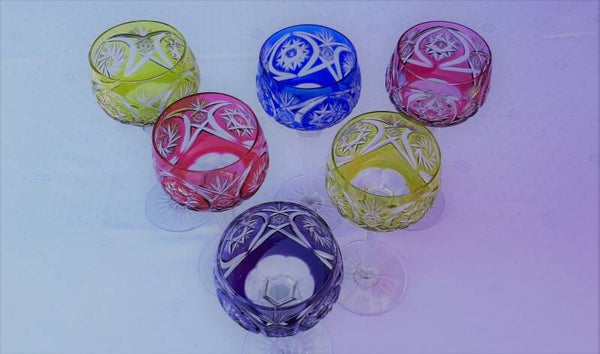 6 mooie geslepen kristallen glazen in verschillende kleuren.