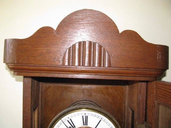 Oude Hangklok Met ingelegde houten figuurtjes ter versiering. Aan de boven- en onderkant versierende houten ornamenten.