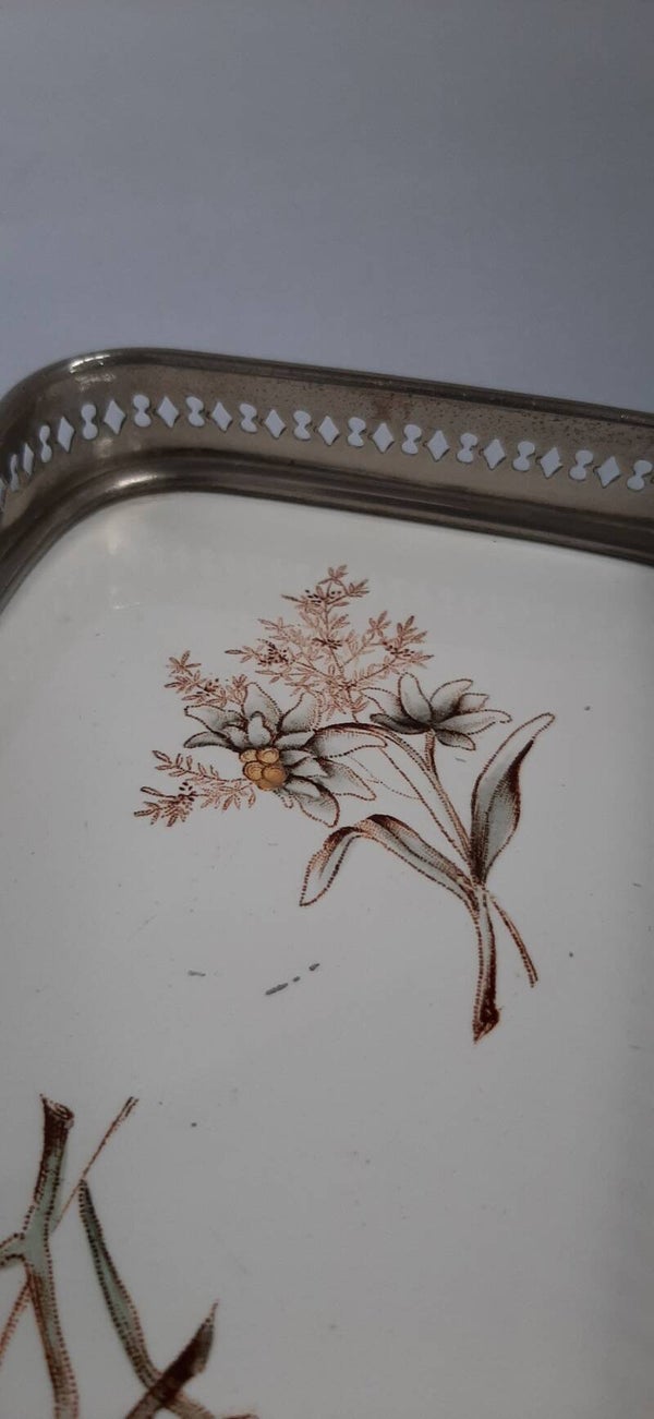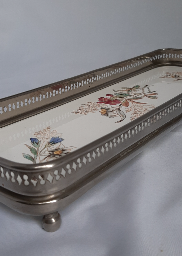 Mooi oud serveerblaadje van keramiek met een verchroomde rand.