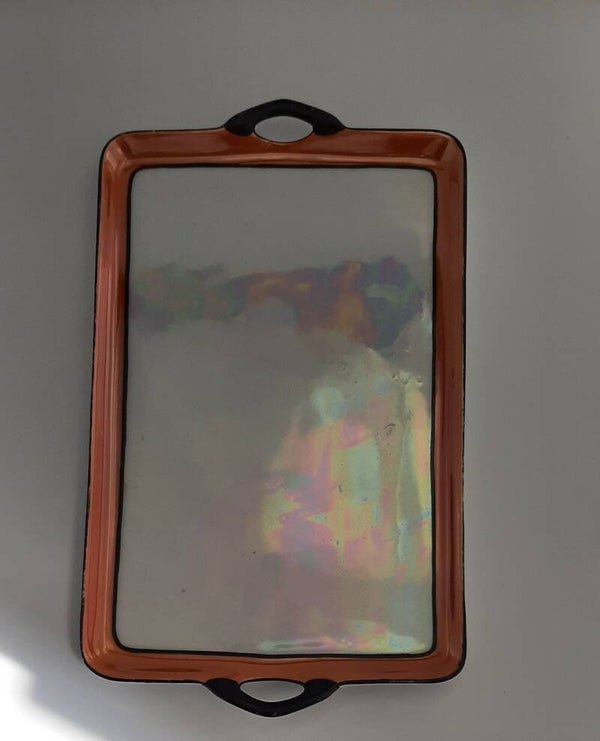 Oranje rand langs wit parelmoer ( goudpuster) glazuur. Afgewerkt met dun zwart randje en zwarte greepjes.