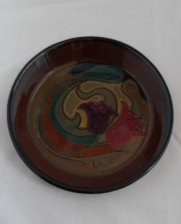1 klein schaaltje, diameter 13 cm. Basiskleur bruin met tulpmotief. Gemerkt No=5 Gouda Holland C.B.