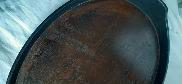 Leuk charmant kuipblad. Donkerbruin. Strak vormgegeven, gladde oplopende rand naar de zijkant. Kleine gebruikssporen.