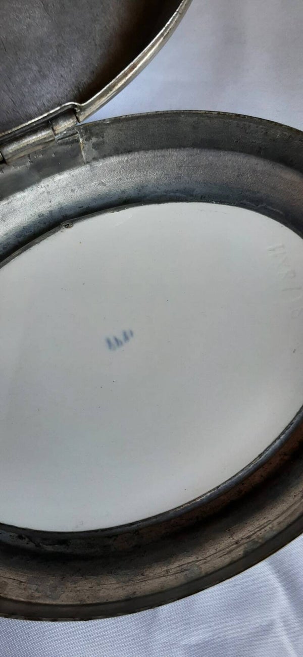 Oud verchroomd metalen koektrommeltje. Ovaal. Met Blauw/wit gedecoreerde, keramiek tegel in de deksel. Het trommeltje staat op een verchroomd blaadje. Het deksel is scharnierend. Tegel gemerkt.
