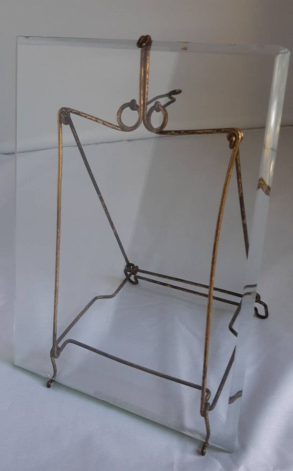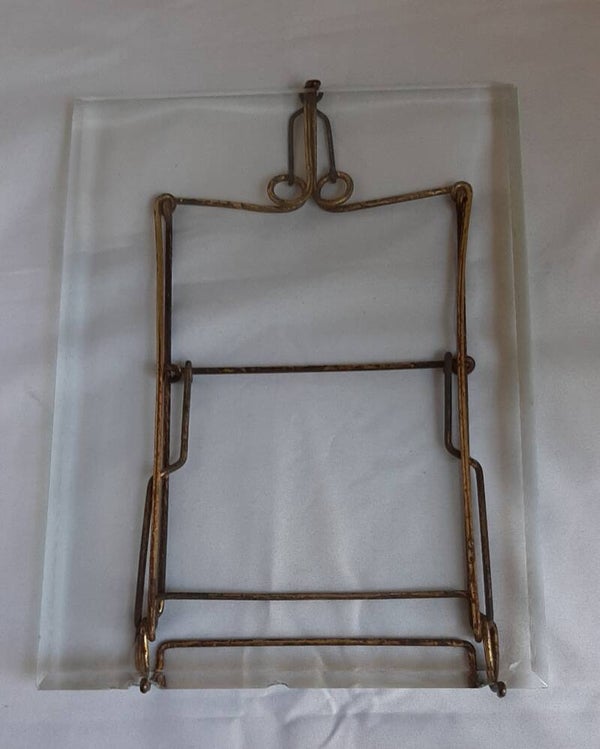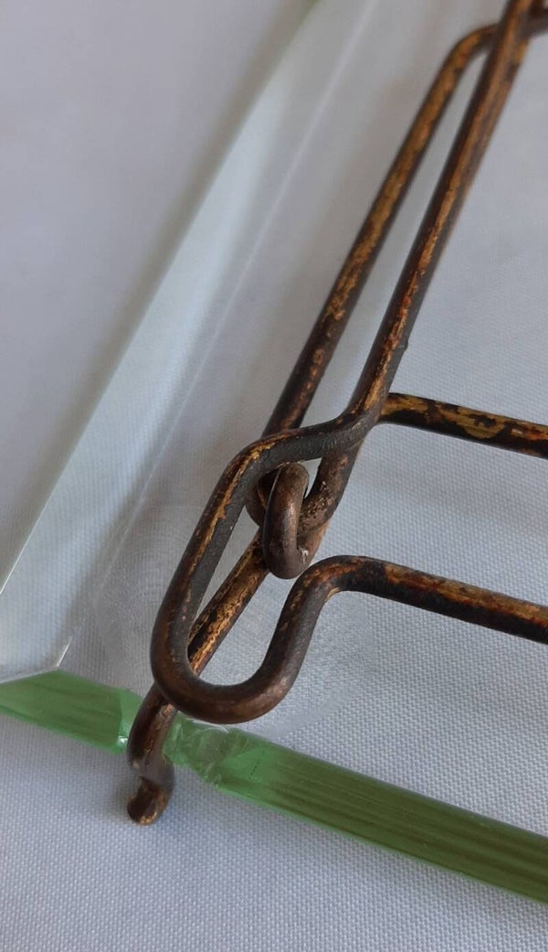 Oude glazen fotohouder met koperen klem en geslepen randen.